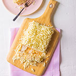 Camadas de biscoito e creme de chocolate branco, cobertas com raspas e fios de chocolate branco.