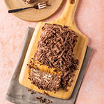 Camadas de biscoito e creme de chocolate, cobertas com raspas e fios de chocolate ao leite.