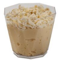 Mousse de chocolate branco coberta com raspas de chocolate branco.