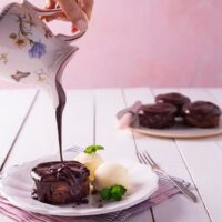 Suflê de chocolate com cobertura de chocolate.