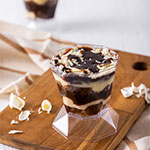 Camadas de suflê de chocolate com creme mesclado, morango e marshmallow.